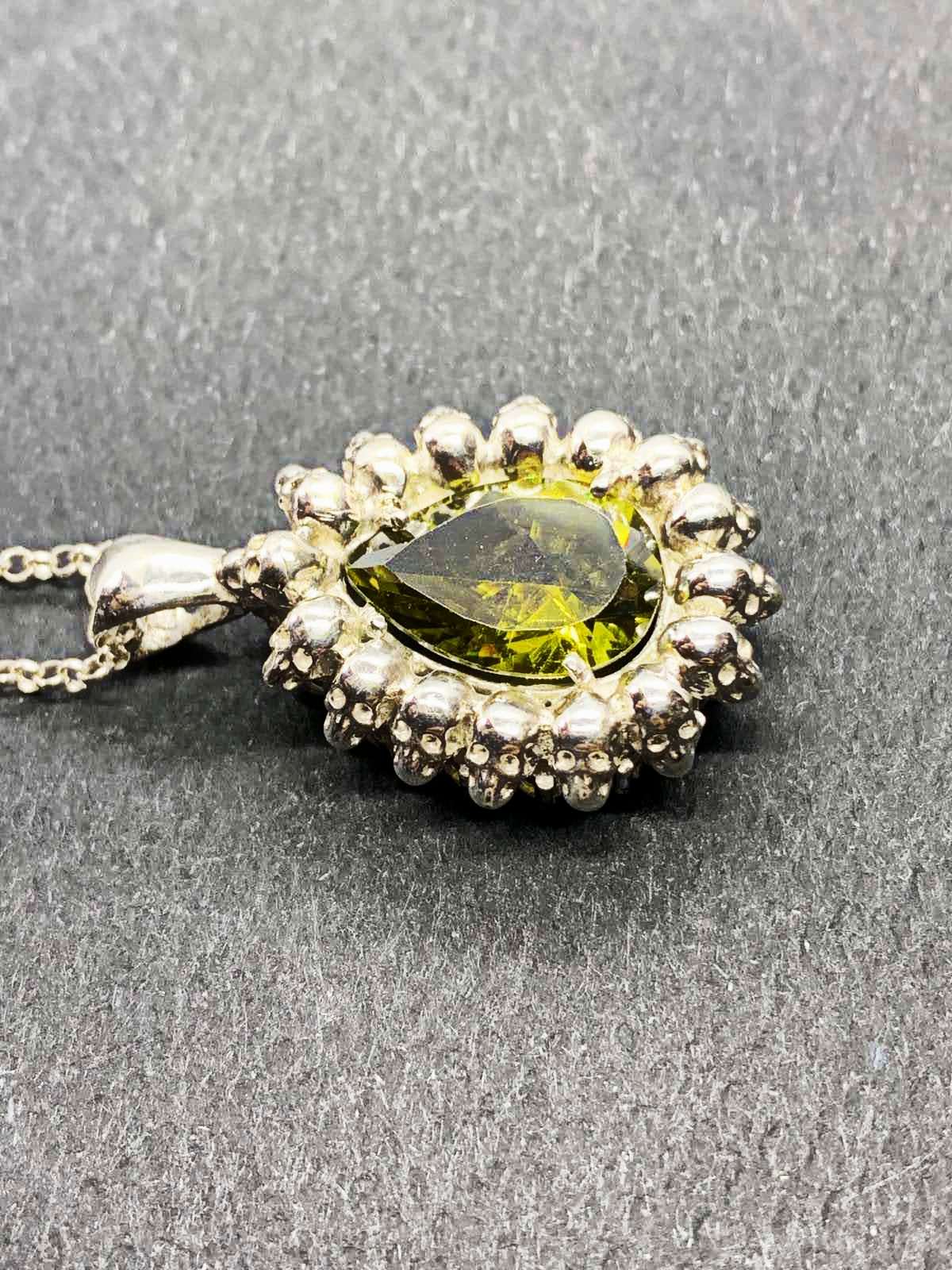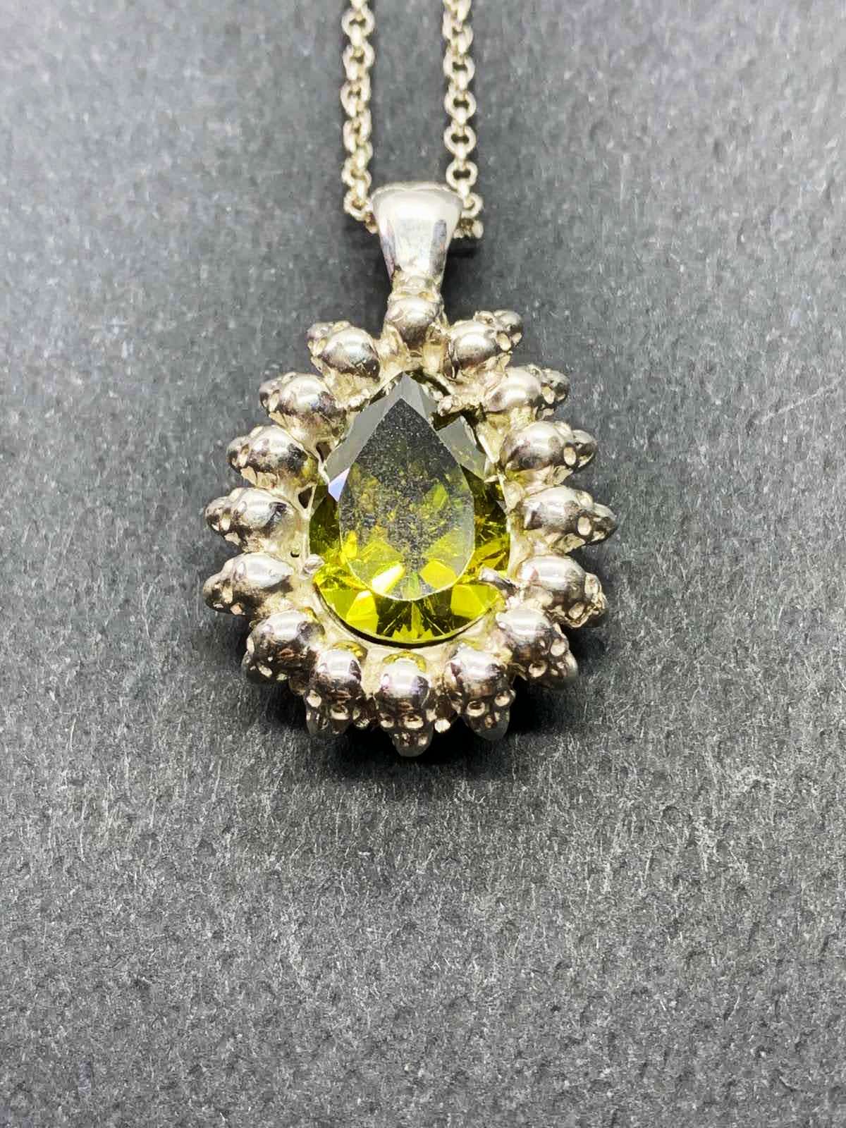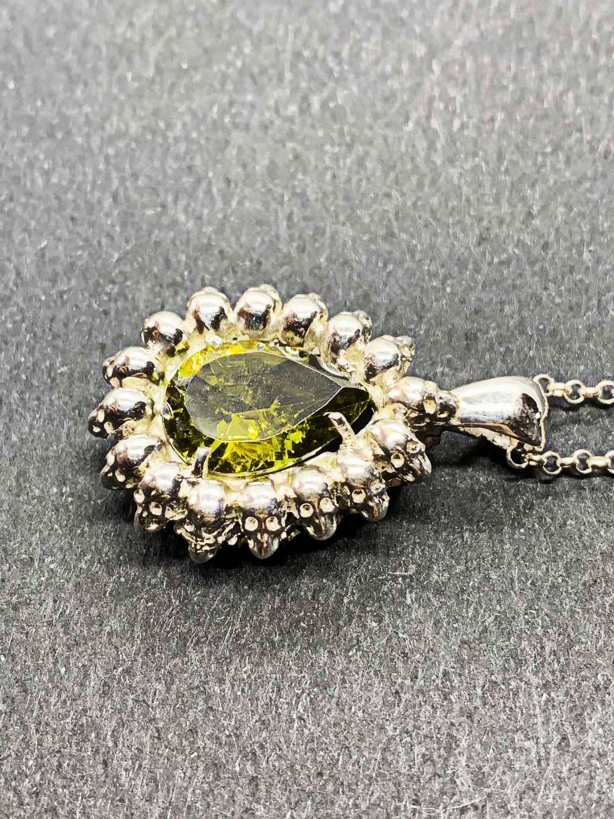 Poir Pendant set with one synthetic peridot, handcrafted from silver.